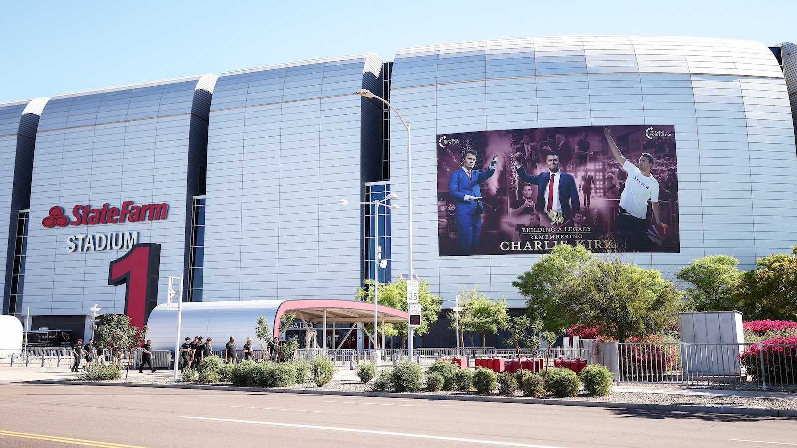 A Sept. 19, 2025, drone view of staff putting in a photograph of slain conservative commentator Charlie Kirk is proven forward of a memorial service to be held for him on Sept. 21, at State Farm Stadium, in Glendale, Arizona.