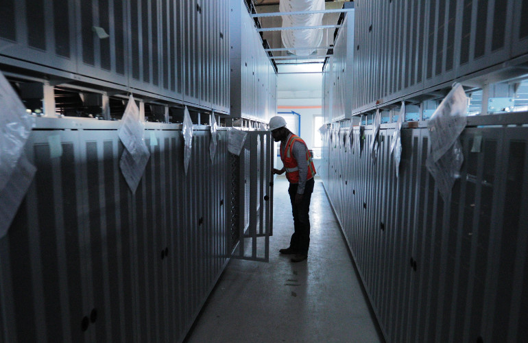 Archival photograph of Moss Touchdown, and the inverters exterior the constructing housing the lithium-ion battery banks.
