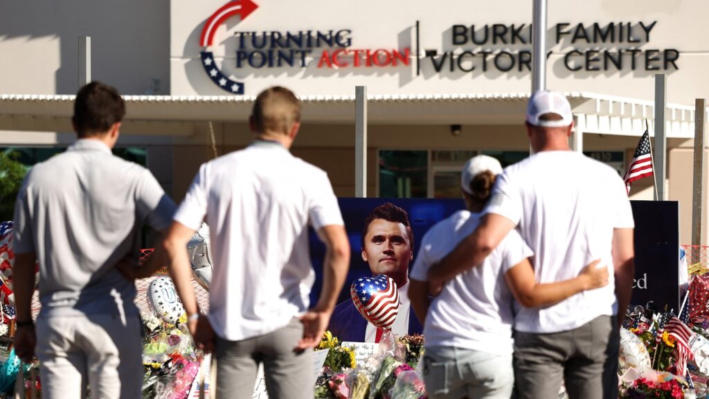 Folks mourn Turning Level USA Founder Charlie Kirk at a memorial arrange exterior of the Turning Level USA headquarters on September 12, 2025 in Phoenix, Arizona.