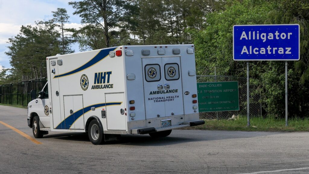 An ambulance arrives on the entrance to “Alligator Alcatraz” on the Dade-Collier Coaching and Transition Airport, August 14, 2025 in Ochopee, Florida.