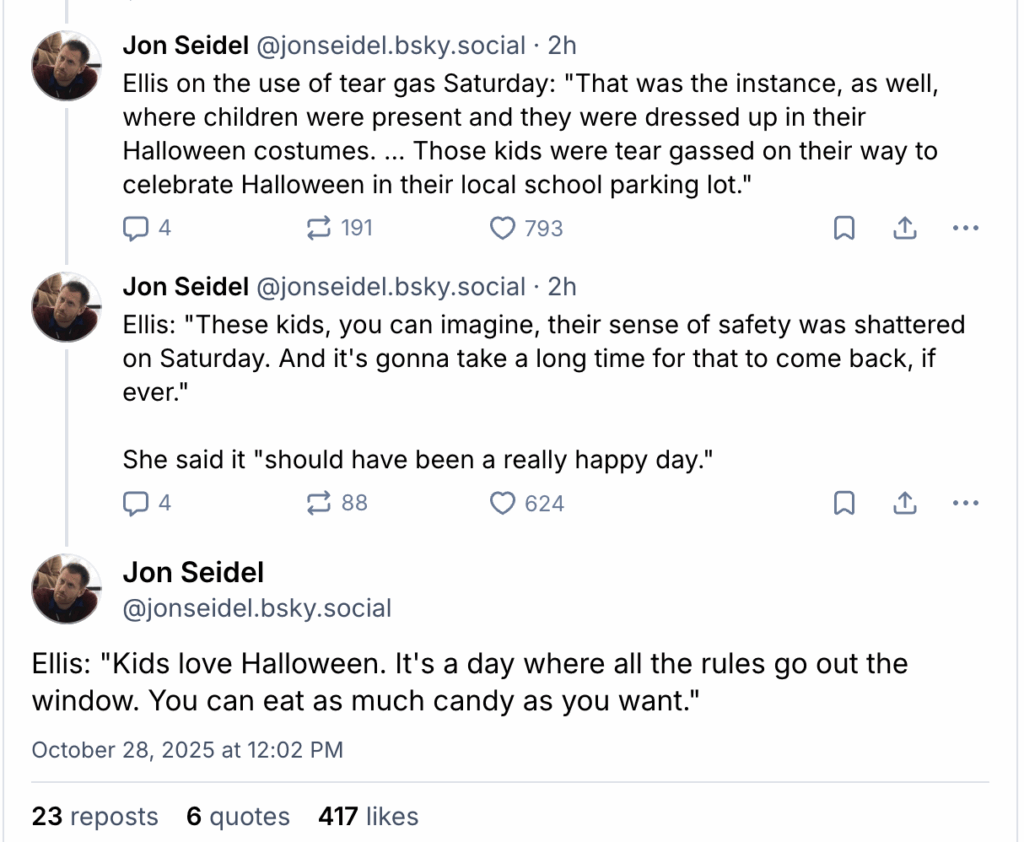 So the choose hauled Bovino into court docket as we speak to impress upon him the seriousness of the TRO and what types of actions are off limits. Particularly, Choose Ellis is deeply involved that Border Patrol’s actions in utilizing tear fuel with out acceptable warnings really impacted innocents, particularly youngsters wearing Halloween costumes, headed to a parade.