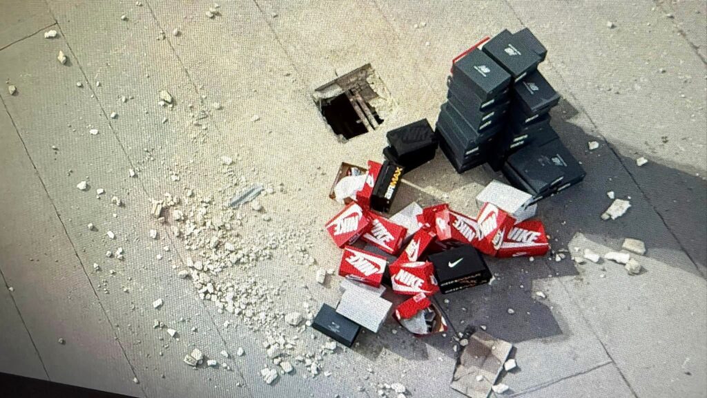 Masked robbers reduce a gap within the concrete roof of a Florida mall earlier than dropping in to steal 400 to 500 pairs of Nike and New Stability sneakers, the Martin County Sheriff’s Workplace introduced this week.