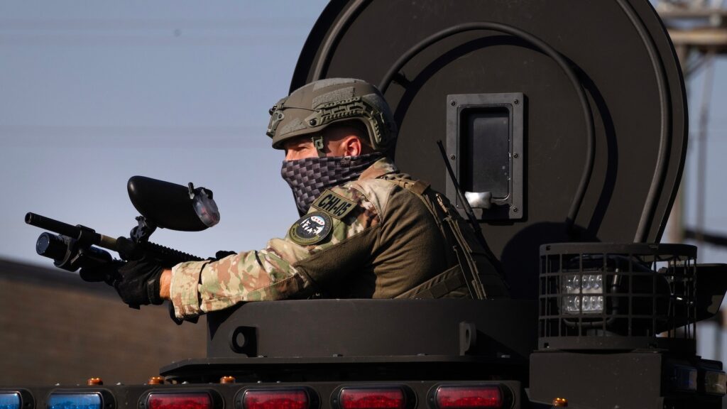 A federal regulation enforcement brokers confronts demonstrators from the turret of an armored car throughout a protest outdoors an immigrant processing and detention heart on Oct. 3, 2025, in Broadview, Illinois.