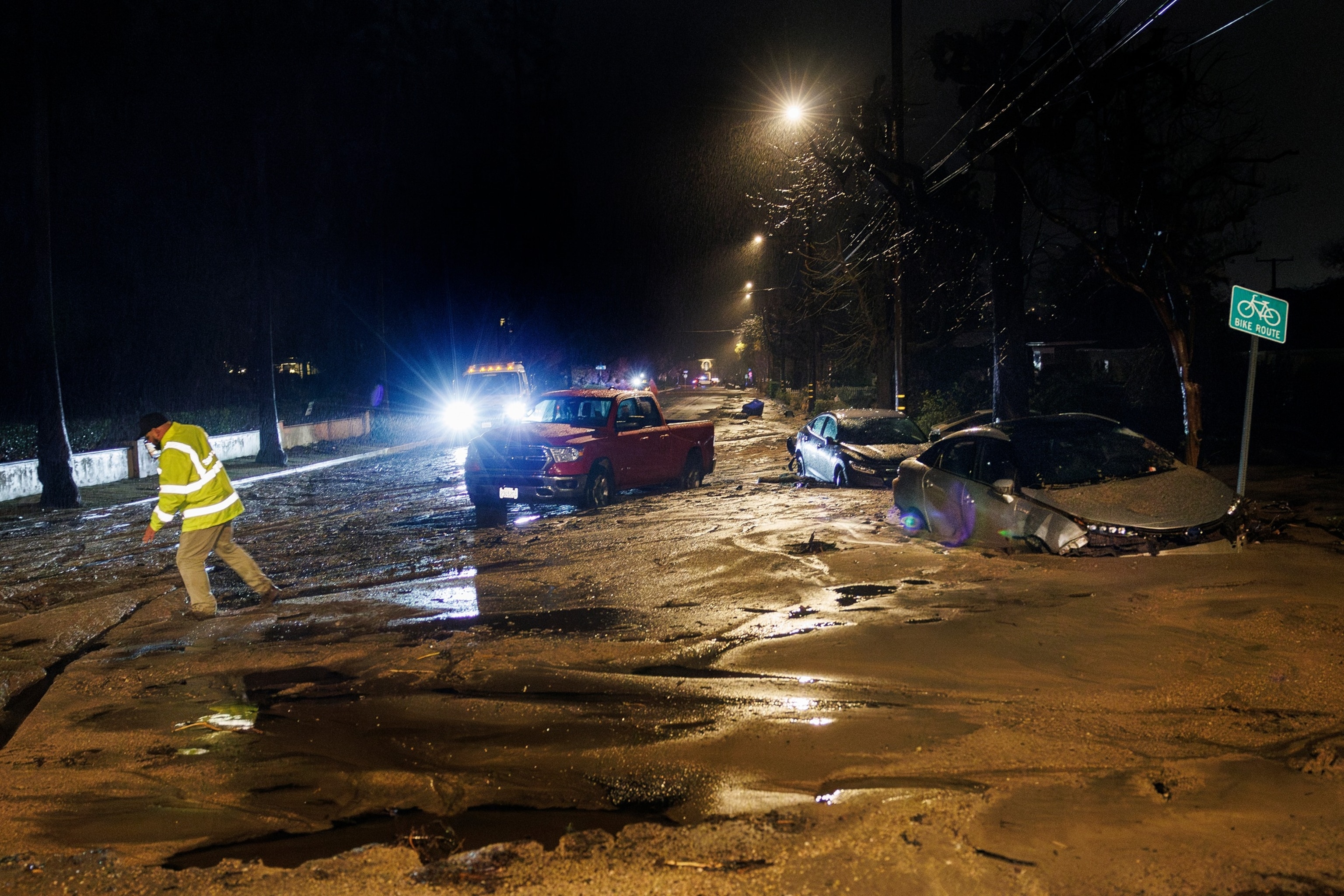 On this Feb. 13, 2025, file picture, heavy rains created a mud stuffed particles movement sending vehicles down Tanoble Drive onto Mendocino Road within the Eaton fireplace burn space, in Altadena, Calif.
