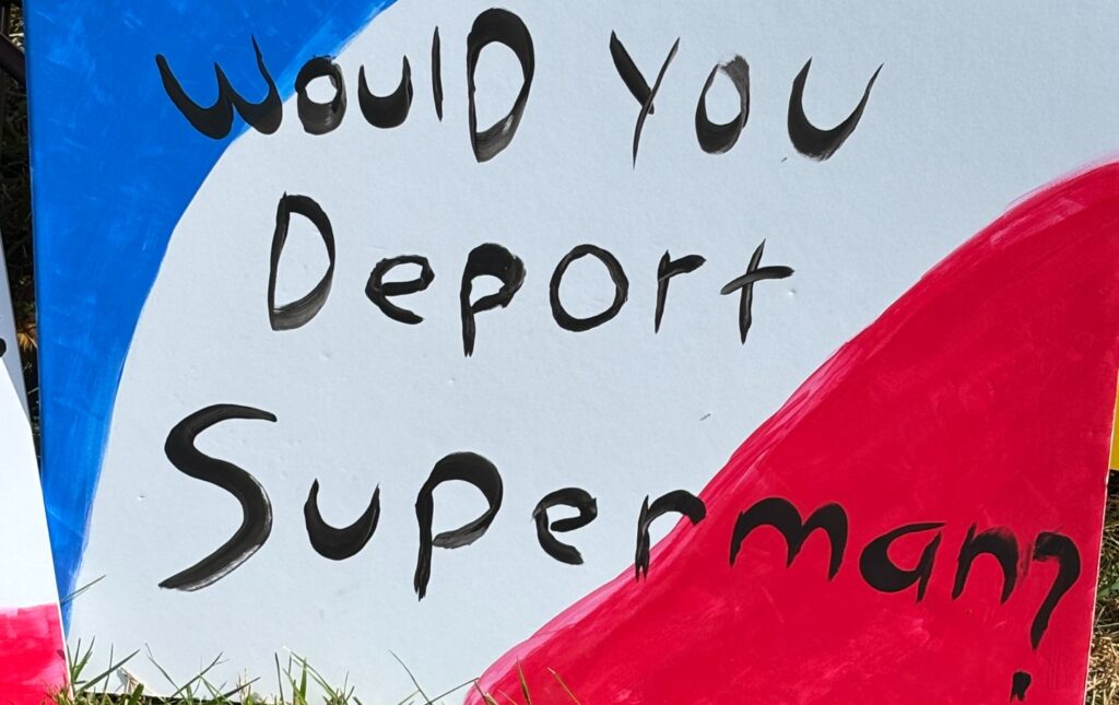Brewster, NY—I noticed no Antifa. I did see AMPHIFA: a girl dressed as a frog waving a flag and an indication proclaiming “Amphibians Towards Fascism.” I noticed unicorns and extra frogs, an older girl driving a blow-up horse, a bunch of children fascinated by her horse, and a good-looking immigrant Superman (a family-practice physician in Ossining) carrying an indication asking, “Would you deport Superman?” (That’s a tough no, from me.)