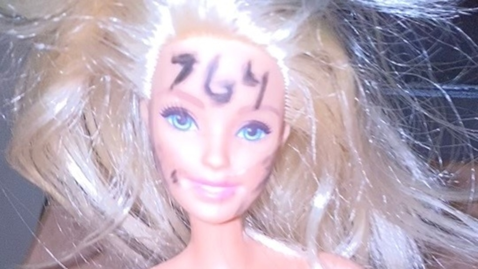 An undated picture discovered by Vernon, Connecticut, police on the gadgets of a 17-year-old lady related to the net community 764 exhibits a Barbie Doll marked with “764.”