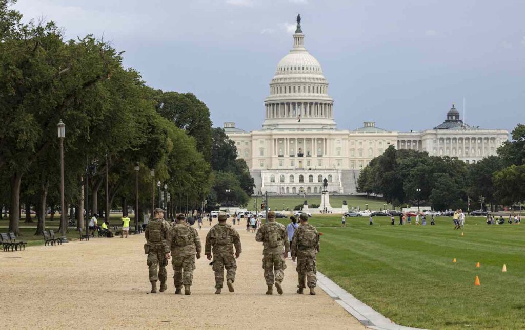 Members of the Nationwide Guard stroll on the Nationwide Mall on August 14, 2025 in Washington, DC, following President Donald Trump’s deployment of federal forces and takeover of town’s police division.