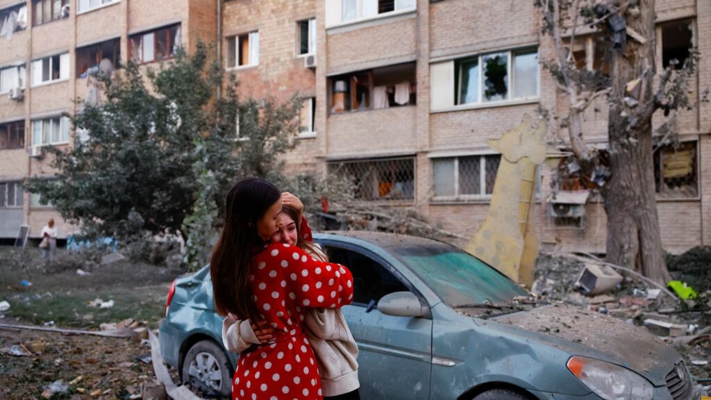 Girls react as they stand on the web site of a constructing which was hit by a Russian missile and drone strike, amid Russia’s assault on Ukraine, in Kyiv, Ukraine August 28, 2025.