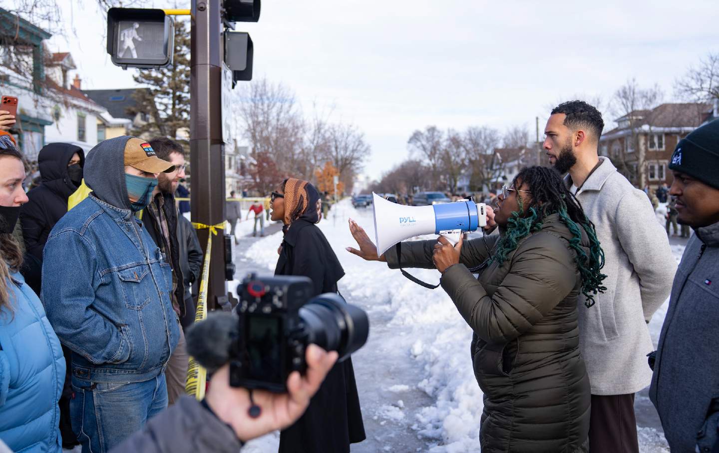 Minneapolis Metropolis Council member Robin Wonsley speaks to acrowd of bystanders close to the scene the place federal brokers shot and killed a girl earlier on Portland Avenue in Minneapolis, Minnesota, on January 7, 2026.