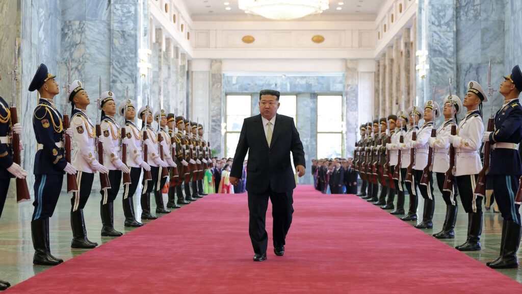 This image taken on September 9, 2025 and launched by North Korea’s official Korean Central Information Company through KNS on Sept. 10, 2025 reveals North Korean chief Kim Jong Un attending the flag-raising ceremony.
