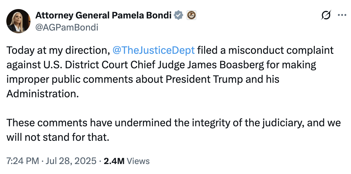 On Monday, July 28, Legal professional Basic Bondi’s Chief of Employees Chad Mizelle hand-delivered an ethics complaint to the US Courtroom of Appeals for the DC Circuit. In usually indignant phrases, it alleged a gross violation of judicial ethics by Chief Decide James Boasberg of the US District Courtroom for the District of Columbia.