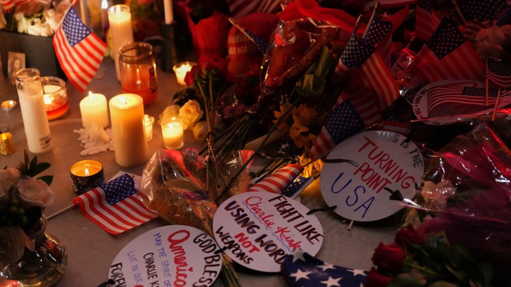 Flags, candles and indicators sit at a vigil for Charlie Kirk, the CEO and co-founder of Turning Level USA who was shot and killed, Thursday, Sept. 11, 2025, in Orem, Utah.