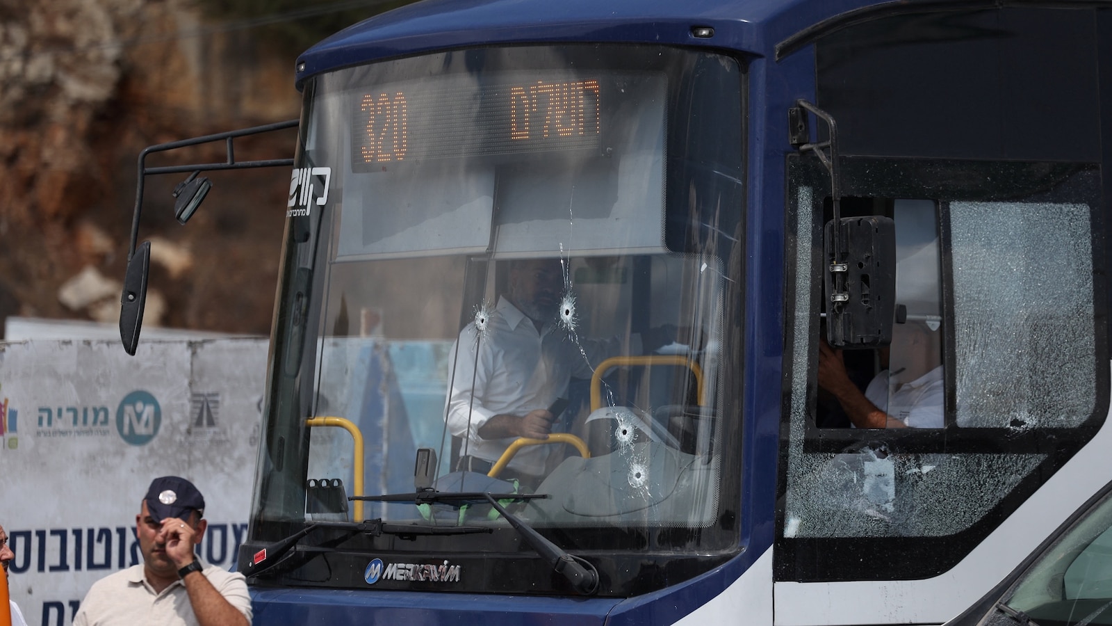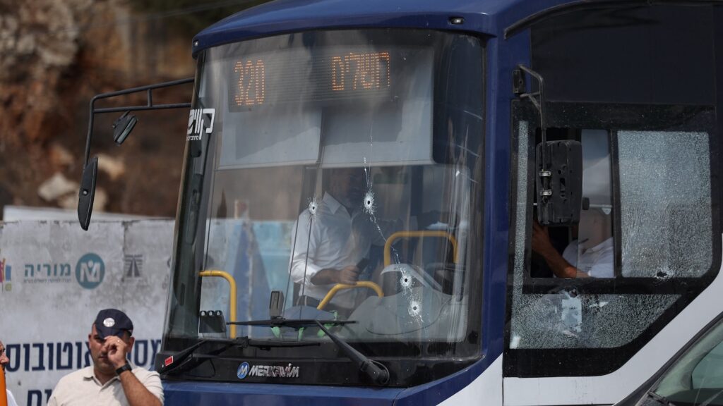 Individuals examine a bus with bullet holes within the windshield on the scene the place a suspected capturing assault befell on the outskirts of Jerusalem, Sept. 8, 2025.