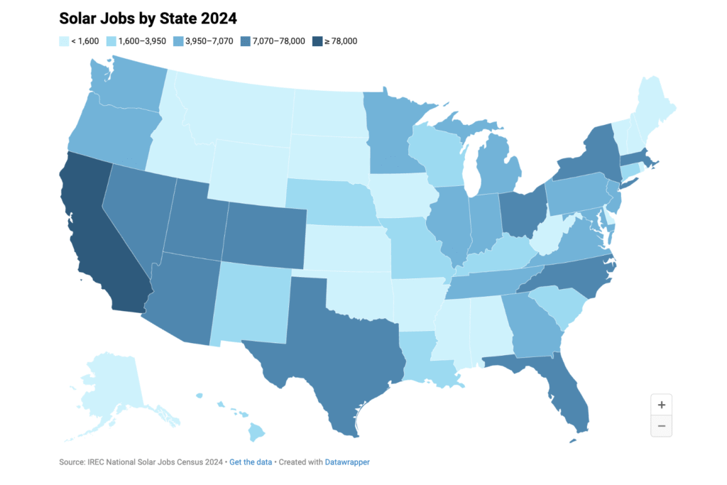California remained the highest state for photo voltaic jobs in 2024 regardless of shedding roughly 1,000 jobs after state coverage adjustments affected its residential market. Florida, Texas, New York and Massachusetts adopted because the next-largest employers of photo voltaic employees. For the fourth consecutive 12 months, Nevada ranked first in photo voltaic jobs per capita. Explore an interactive map of Solar Jobs by State here.