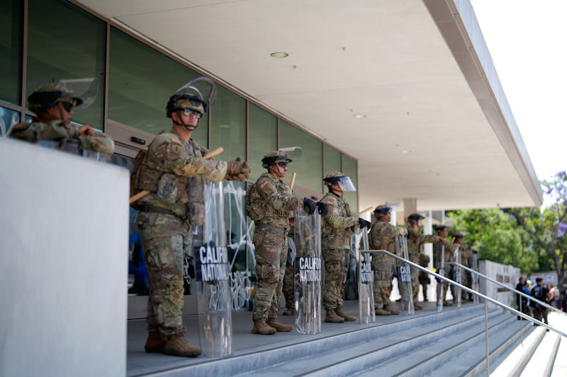 Nationwide Guard troops stand guard close to the Metropolitan Detention Heart on June 9 in downtown Los Angeles. (Photograph by Eric Thayer/The Related Press)