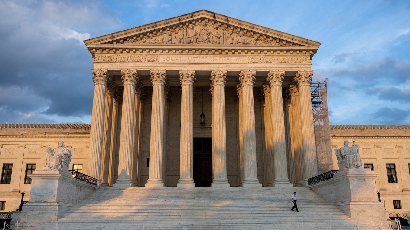 A safety guard walks down the steps of the U.S. Supreme Court docket in Washington, July 19, 2024.