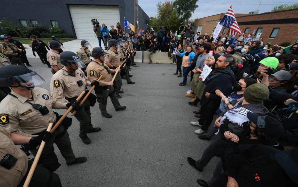 Protesters face off in opposition to border brokers outdoors the ICE detention facility in Broadview, Illinois.