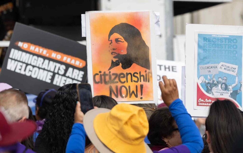A group coalition of labor, immigrant, and civil rights teams rally at MacArthur Park in Los Angeles on August 12.