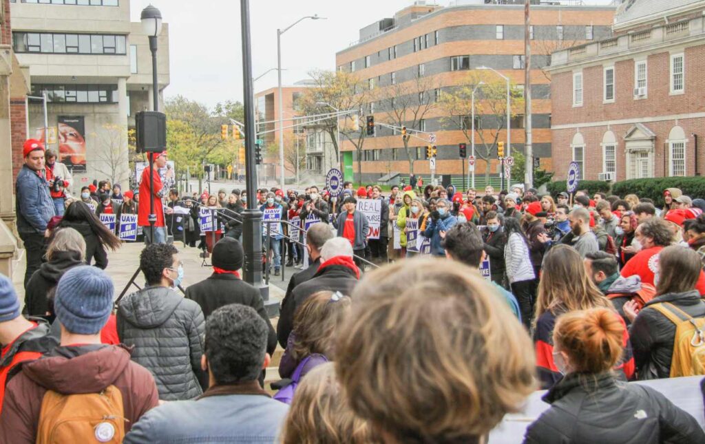 The Harvard Graduate Pupil Union–United Vehicle Employees throughout a rally in 2021.
