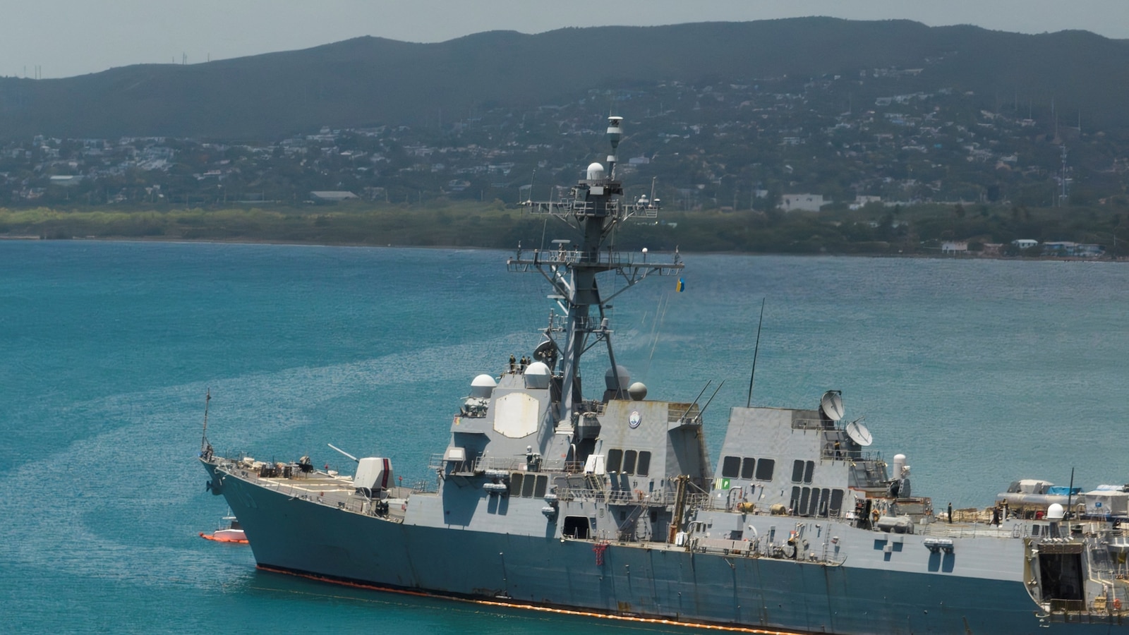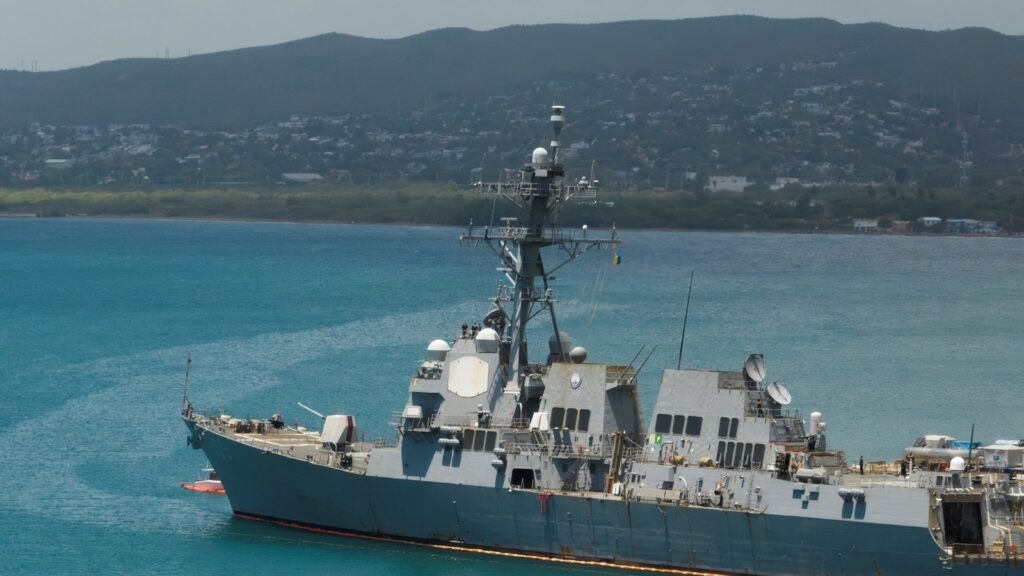 A drone view exhibits the U.S. Navy guided missile destroyer USS Jason Dunham (DDG-109) because it docks in Ponce, Puerto Rico, September 6, 2025.